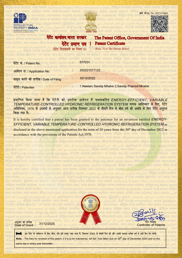 Thermolab Group is granted a patent for its innovative technology – Energy Efficient, Variable Temperature-Controlled Hydronic Refrigeration System